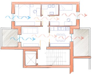 Quindi apriamo le finestre di casa, se possibile contemporaneamente su versanti opposti dell’edificio, o se l’abitazione è su più piani (come è frequente per le case dei centri storici) possiamo sfruttare anche l’effetto camino del vano scala, aprendo il sopraluce del portone d’ingresso, le finestre dei pianerottoli e le porte d’ingresso al piano. Ricordiamo però che l’aria esterna non è priva di inquinanti, per cui preferiamo se possibile, i lati che non si affacciano su strade trafficate e le ore con meno traffico, in extremis nelle ore notturne. Nel caso di doppio affaccio non dimentichiamo che il flusso d’aria va dalla facciata in ombra dell’edificio verso quella soleggiata, e nel caso di più piani dal basso verso l’alto.